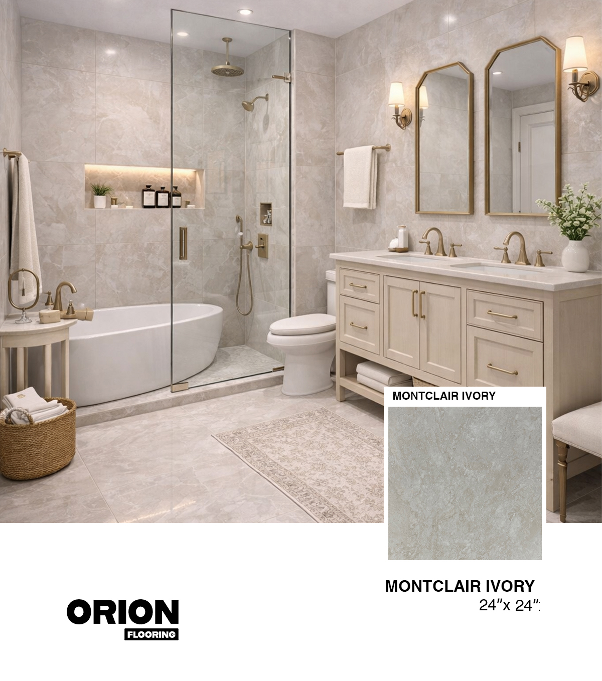 The MONTCLAIR IVORY Porcelain Tile features a soft stone-look design with warm ivory tones and subtle natural movement.