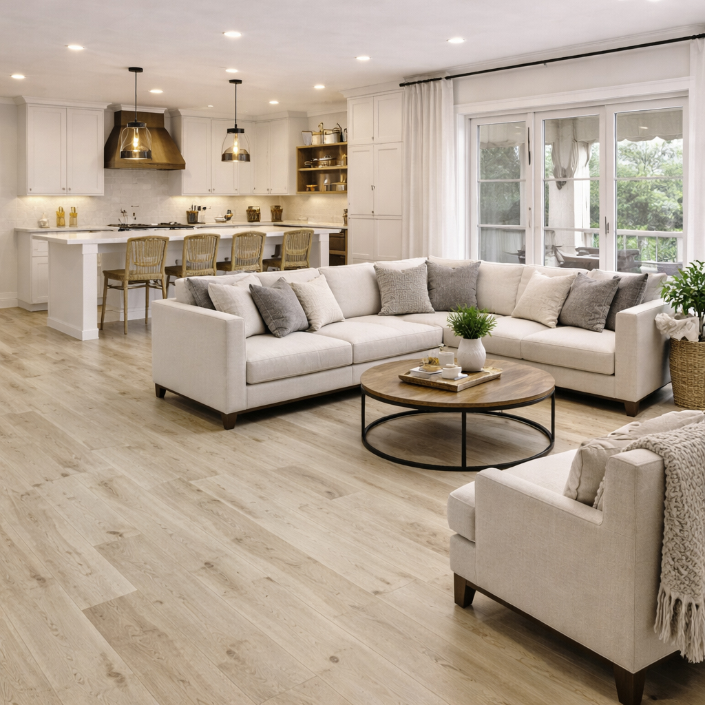he Orion Flooring Modern Ivory Premium Vinyl Flooring features a light wood-look design with soft ivory tones that brighten any space. Its clean and modern style creates a fresh, open feel that works well in many interior designs.