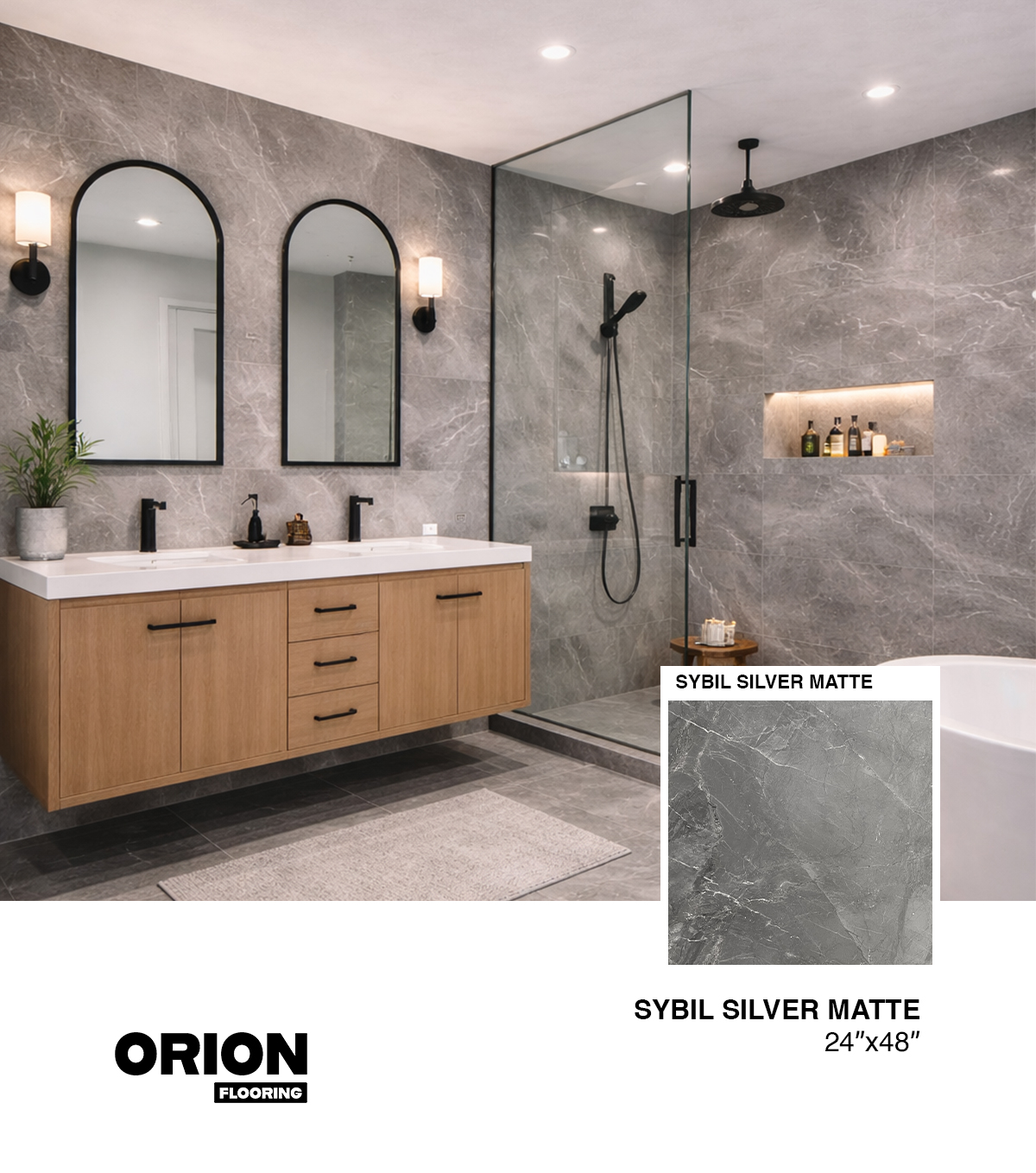 The large 24”×48” size helps reduce grout lines, creating a smooth and seamless look across floors and walls. Also, the matte finish adds a natural feel while reducing glare, making SYBIL SILVER MATTE both practical and stylish.